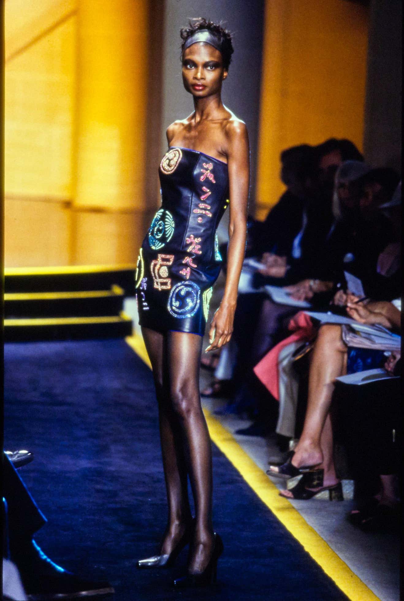 Atelier Versace black leather strapless embellished mini dress, 1997